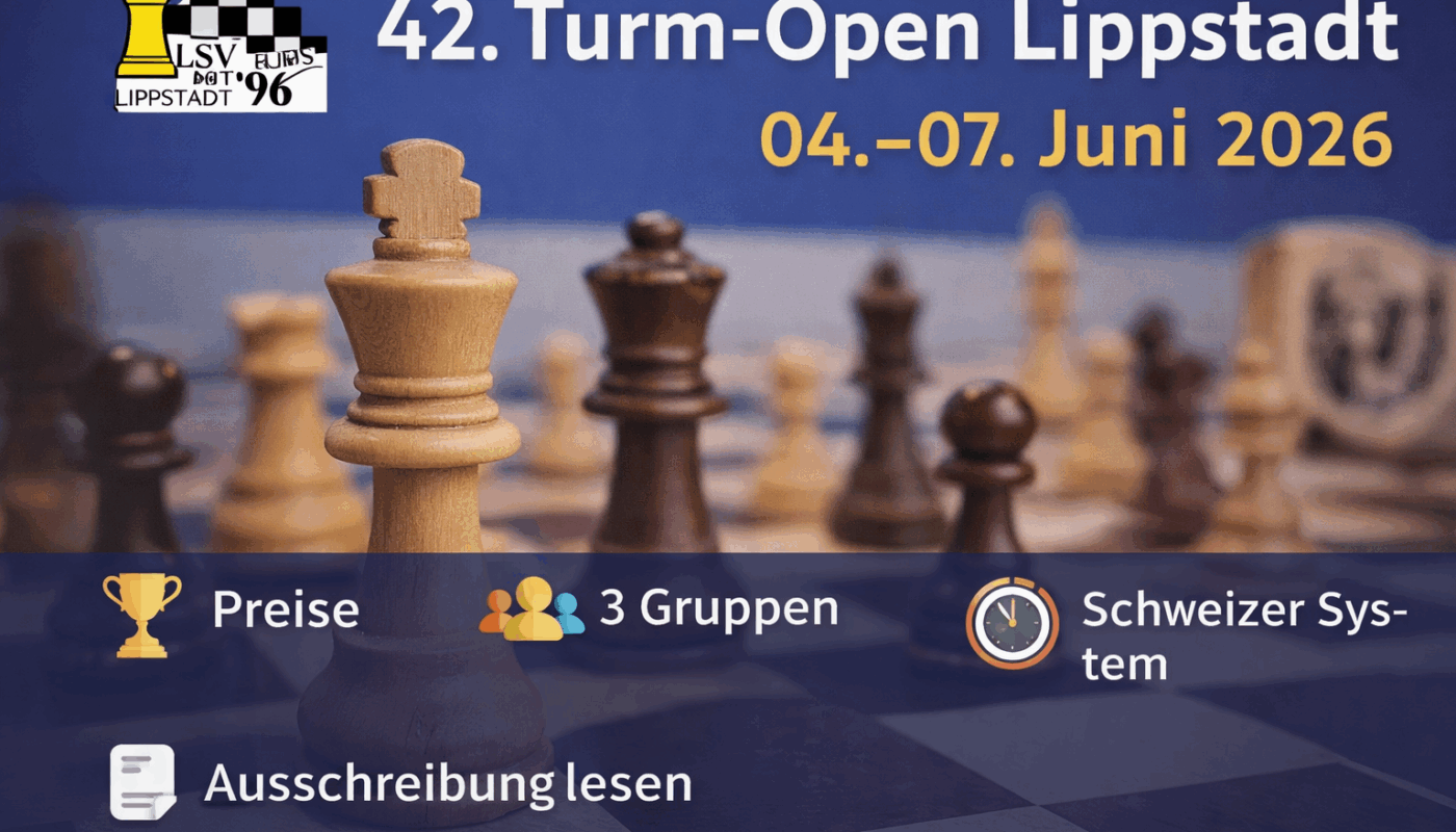 Das traditionsreiche Turm-Open findet vom 4. bis 7. Juni 2026 in der Mensa am Schulzentrum Dusternweg in Lippstadt statt. Gespielt werden 7 Runden im Schweizer System mit klassischer Bedenkzeit (90 Minuten für 40 Züge, danach 30 Minuten + 30 Sekunden pro Zug).