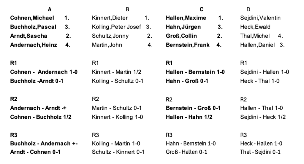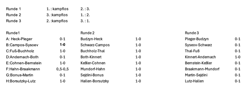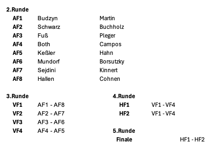 gestern (27.1.26) ist der Vereinspokal mit 24 Teilnehmern gestartet. Um in die KO-Phase zu gelangen mussten die Spieler in insgesamt 8 Gruppen mit jeweils 3 Teilnehmern unter die Top 2 ihrer Gruppe kommen. Die Spieler wurden in drei Töpfe unterteilt und dann per Losverfahren ihren Gruppen zugeordnet. Während sich die Top 8 makellos zum Gruppensieger und somit den „angenehmeren“ Weg für das Achtelfinale sichern konnten, gab es um Platz 2 Überraschungen. Denn mit John Martin und Marius Pleger konnten sich zwei „Underdogs“ qualifizieren.